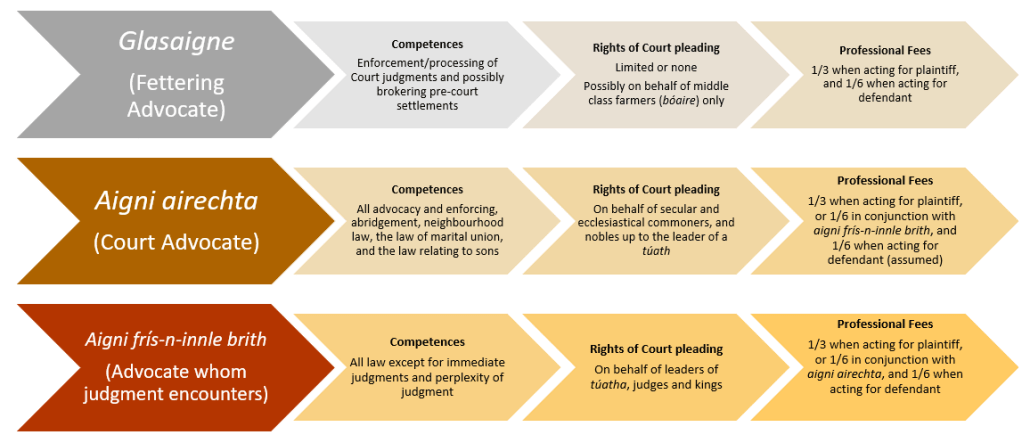 The second type, the aigni airechta (‘court advocate’), appears to have been the closest comparator to a modern day barrister with a general practice, and indeed a general practice solicitor exercising their rights of court audience. This aigne is described as: Aignis lais uile 7 nascaireacht 7 berrad 7 comaidhches 7 cáin láomhnai 7 maccslechtai (translation: ‘He is competent in all of advocacy, and enforcing, and abridgement, and neighbourhood law, and the law of marital union, and the law relating to sons’).